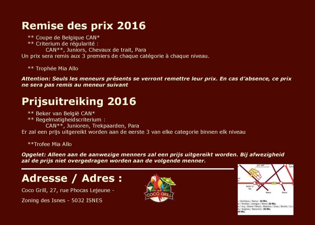 • Criterium de régularité : CAN**, Juniors, Chevaux de trait, Para. Un prix sera remis aux 3 premiers de chaque catégorie à chaque niveau.