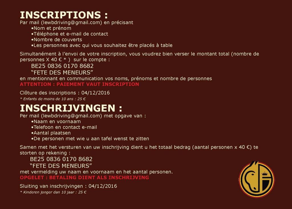 Simultanément à l’envoi de votre inscription, vous voudrez bien verser le montant total (nombre de personnes X 40 € / Enfants de moins de 10 ans : 25 €) sur le compte : BE25 0836 0170 8682 - “FETE DES MENEURS” - en mentionnant en communication vos noms, prénoms et nombre de personnes. ATTENTION : PAIEMENT VAUT INSCRIPTION