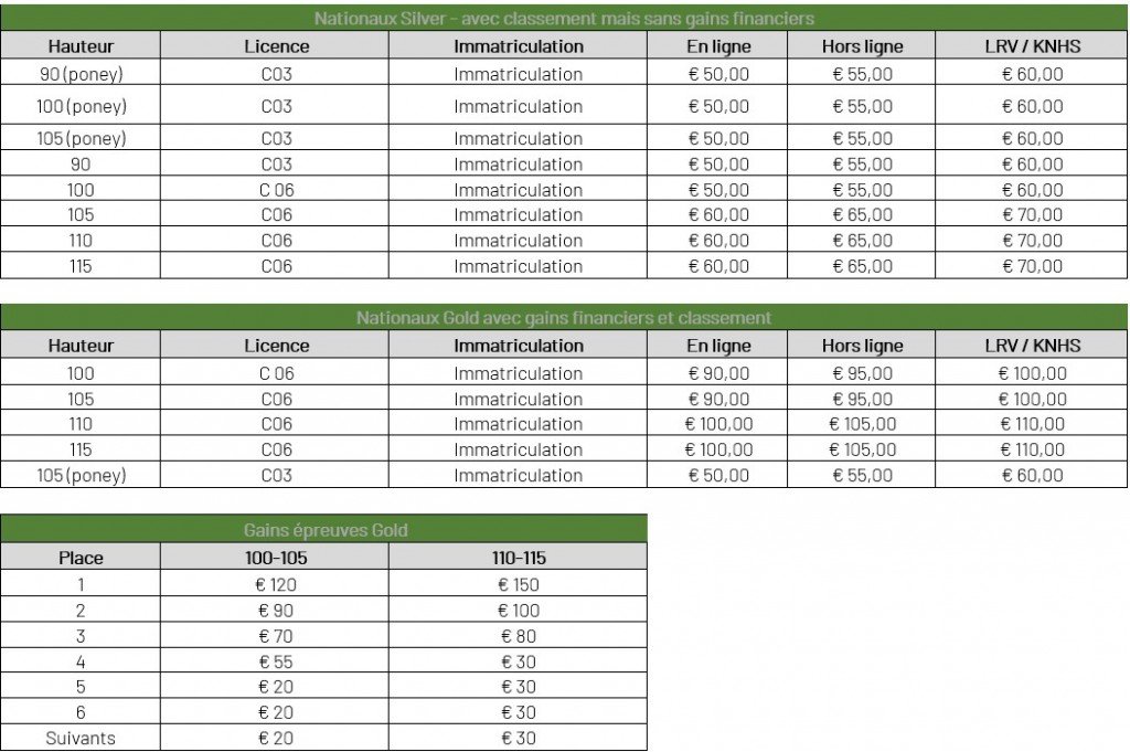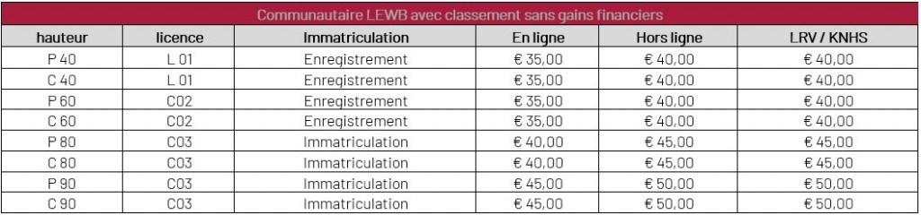 • Pour les concours Bronze (communautaire), les droits d'inscription restent les mêmes que pour les anciens concours de Paardensport Vlaanderen. De légers changements sont faits au niveau des communautaires LEWB.