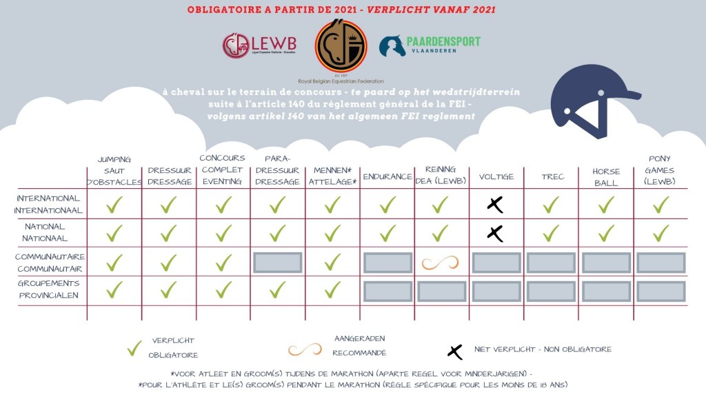 À partir de l’année prochaine, les cavaliers devront toujours porter un casque de protection lors qu’ils seront en train de monter sur le terrain de concours. La Fédération Royale Belge des Sports Equestres et les 2 ligues, la LEWB et Paardensport Vlaanderen, répercute les décisions de la Fédération Equestre Internationale (FEI) dans leurs propres règlements. Il existe parfois des spécificités pour certaines disciplines, vous devrez vous référer aux règlements particuliers qui seront bientôt publiés et d’application en 2021.