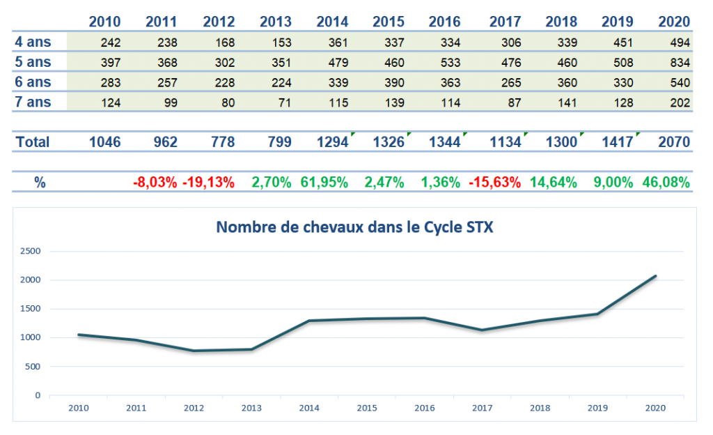 Ces dix dernières années, le cycle STX a subi une véritable métamorphose.  En 2011, 962 chevaux différents ont participé à ce circuit.  Après la première réforme en 2014, le nombre de participations a augmenté de 60 % pour atteindre environ 1.300, et est resté constant au cours des années suivantes.  En 2020, avec le cycle STX 2.0, ce chiffre a augmenté de manière exponentielle et simultanée avec les chiffres du coronavirus, pour atteindre un record de 2070 participations, soit une augmentation d'environ 50 %.  Il est clair que plus de cavaliers veulent participer au cycle, en partie en raison de la qualité des concours et de la variété des parcours.  Il est logique que le principe du cycle ait évolué simultanément et qu'il continue à se développer. Voilà pourquoi il y aura une nouvelle mise à jour cette année.  Le cycle STX est une valeur sûre de qualité depuis des années et en 2021, nous voulons cette qualité pour tous !