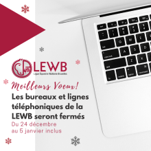 Les bureaux et lignes téléphoniques de la LEWB seront fermés du 24 décembre au 5 janvier inclus.